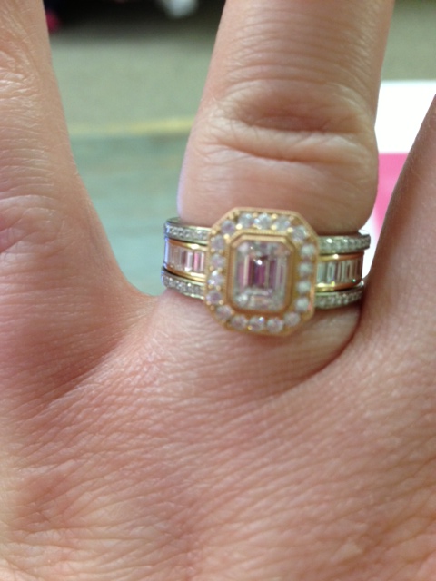 It's gorgeous! Justin and I actually designed it ourselves with Arlington Jewelers in Petoskey. The center band slides out and is actually my wedding band but I get to wear it now because I'm spoiled. (and they don't want the 2 outside bands to bend or get warped.) On the inside of the 2 engagement bands there are 2 small stones. A sapphire and a ruby. Those are our mothers birthstones. I think that is my absolute favorite thing about the ring. Joining our two families with love and happiness.